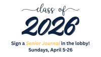 Senior Journals available on Sunday, April 5-26. Journals will be available in the lobby for you to write notes, prayers, affirmations, favorite memories, Scriptures, or words of encouragement for our graduating high school seniors.