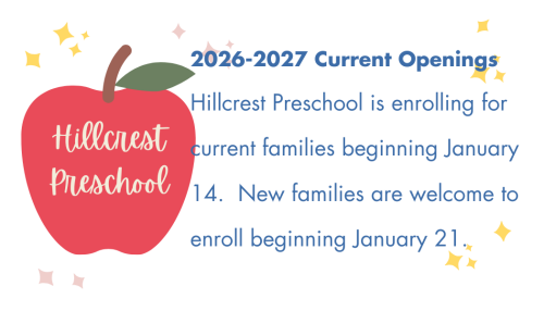 At Hillcrest Weekly Preschool, children experience a safe and welcoming classroom that fosters growth and promotes positive learning experiences. Our program reflects Christian values, inspires an appreciation for the world around them, and builds a foundation for future success.